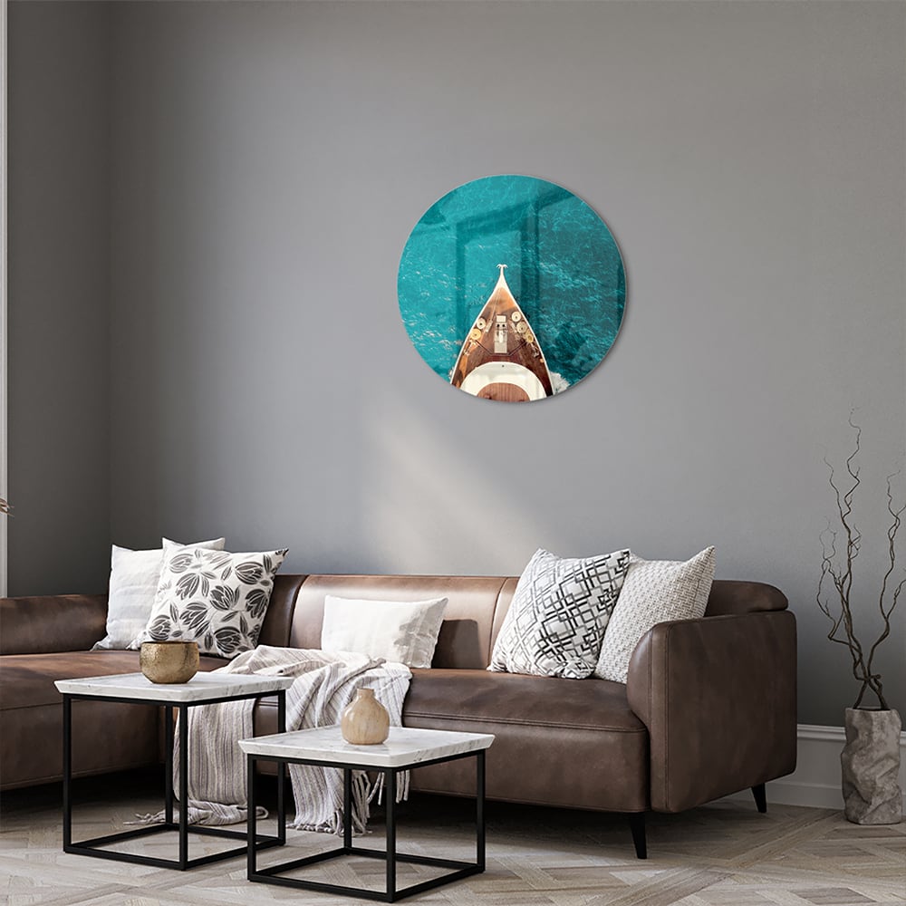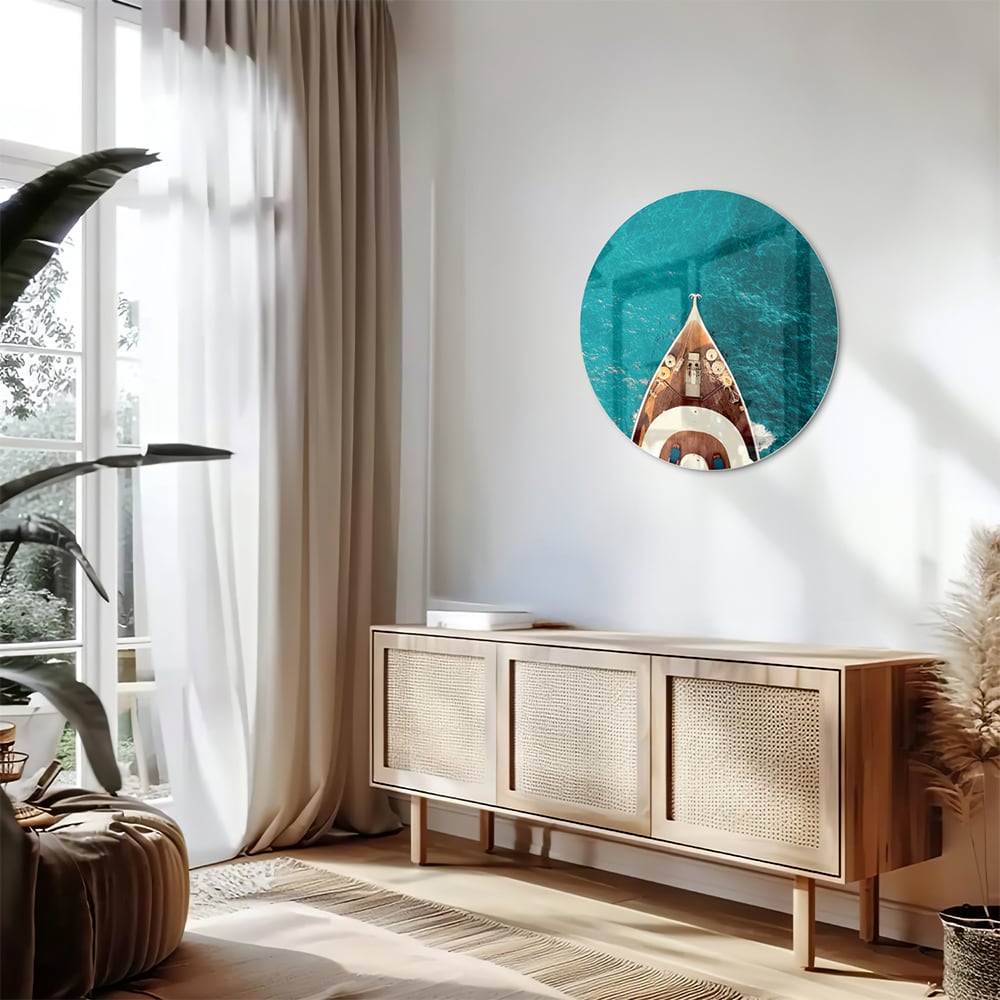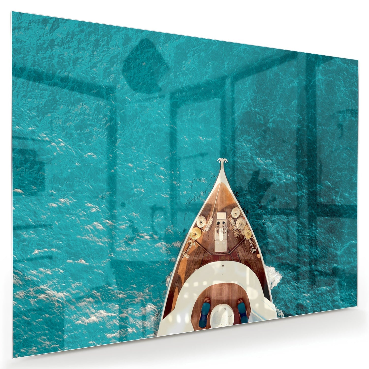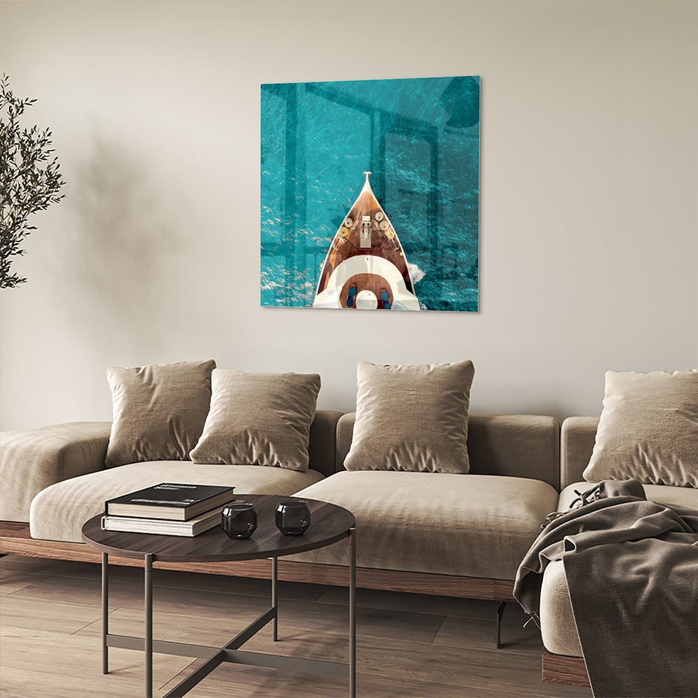 Glazen schilderij van een boot boven water