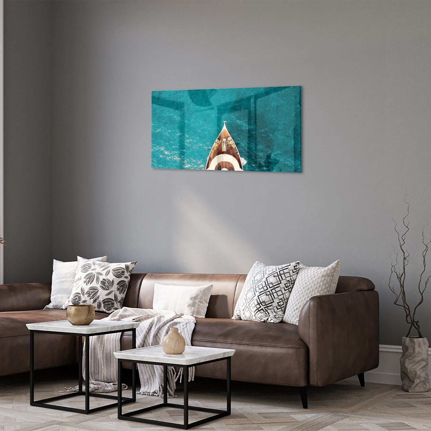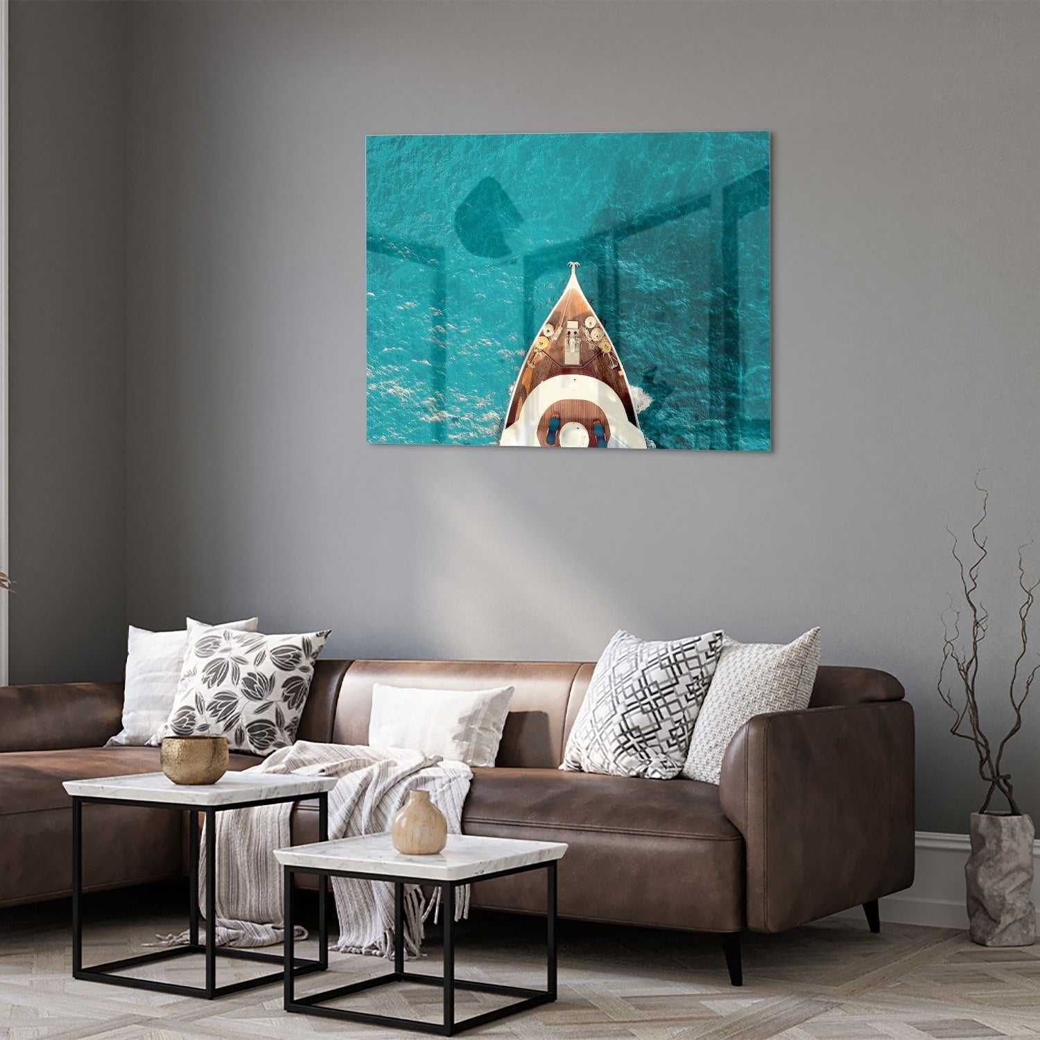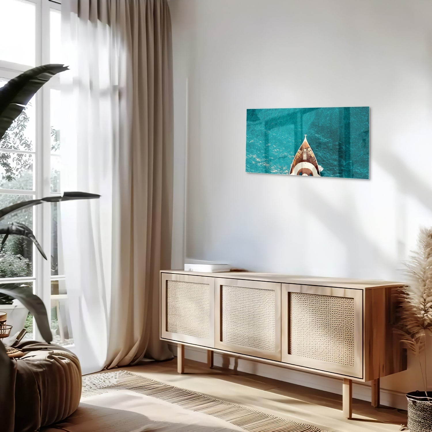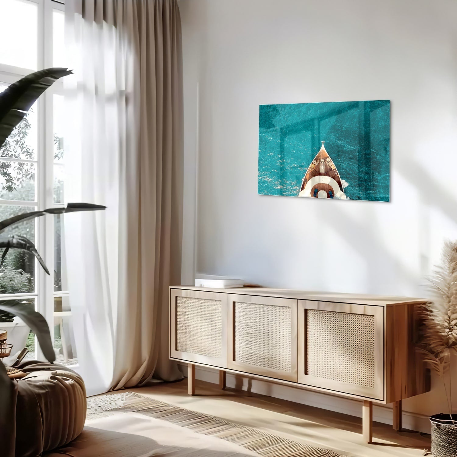 Glazen schilderij van een boot boven water