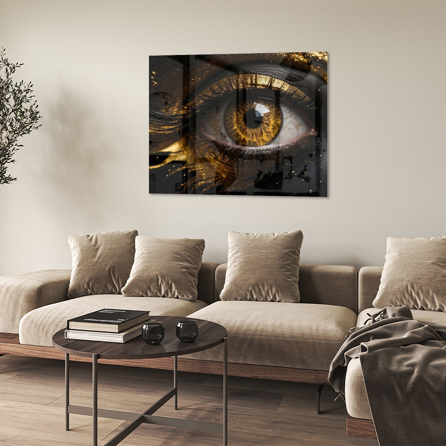 Oogkunstwerk in Goud en Zwart - Glazen Schilderij