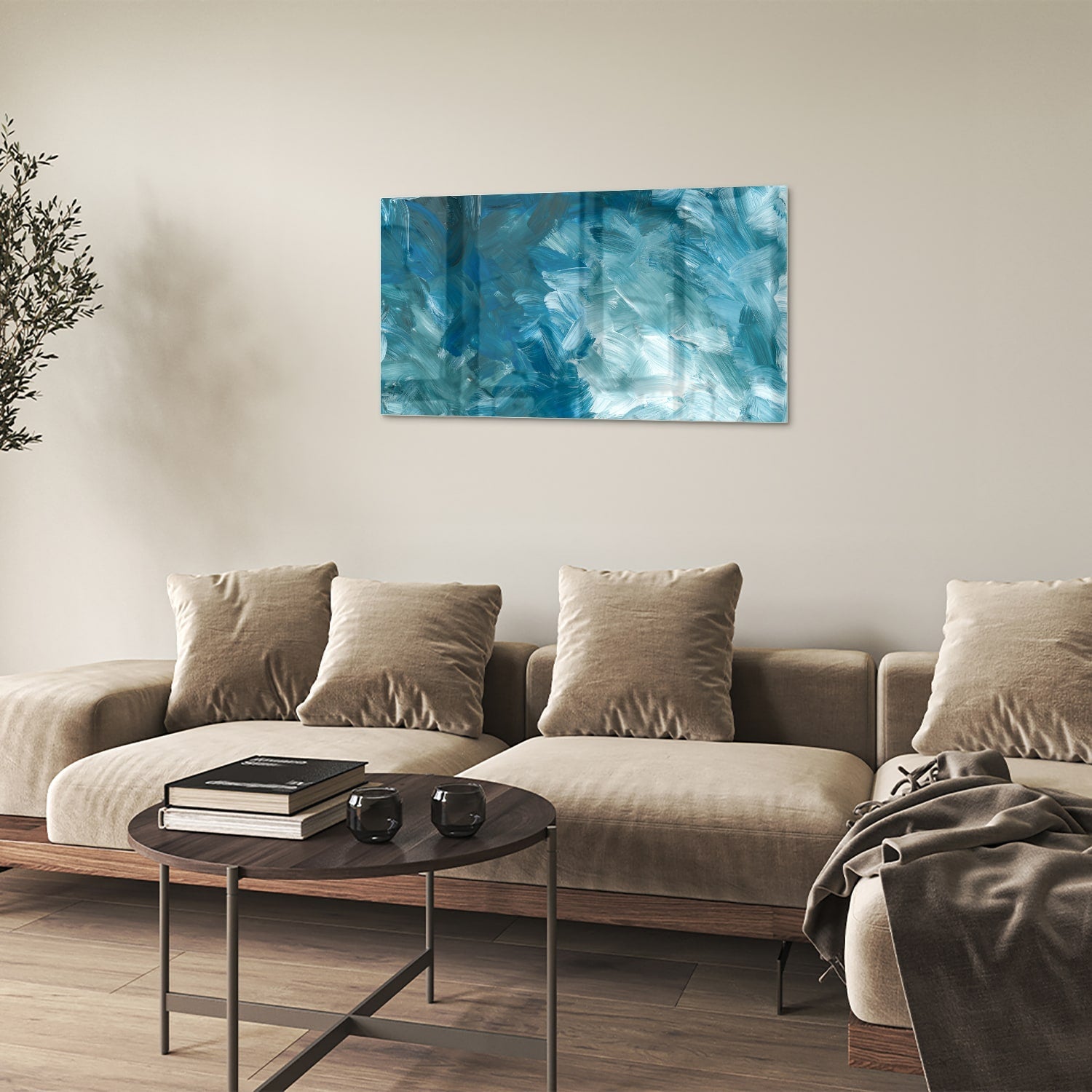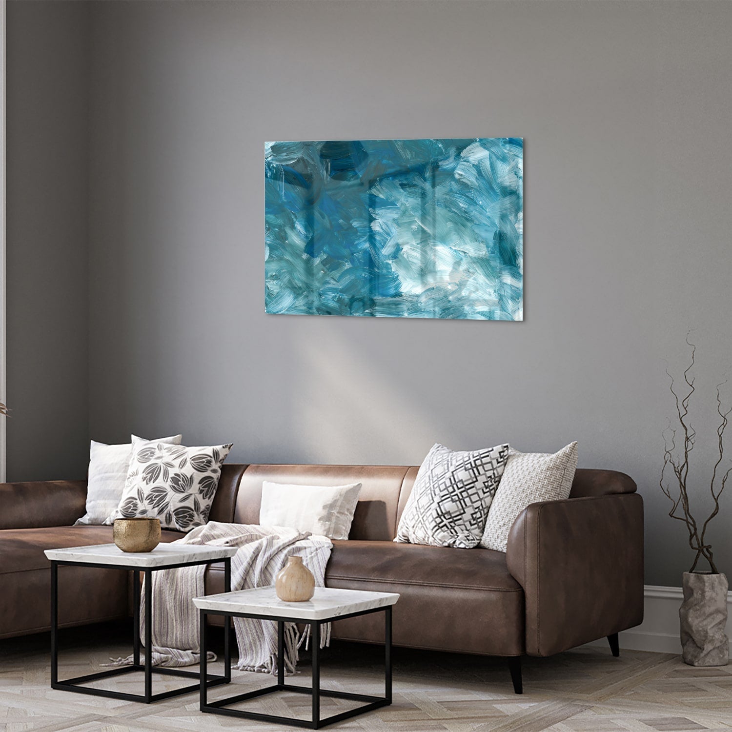 Abstract glazen schilderij in blauw ton sur ton