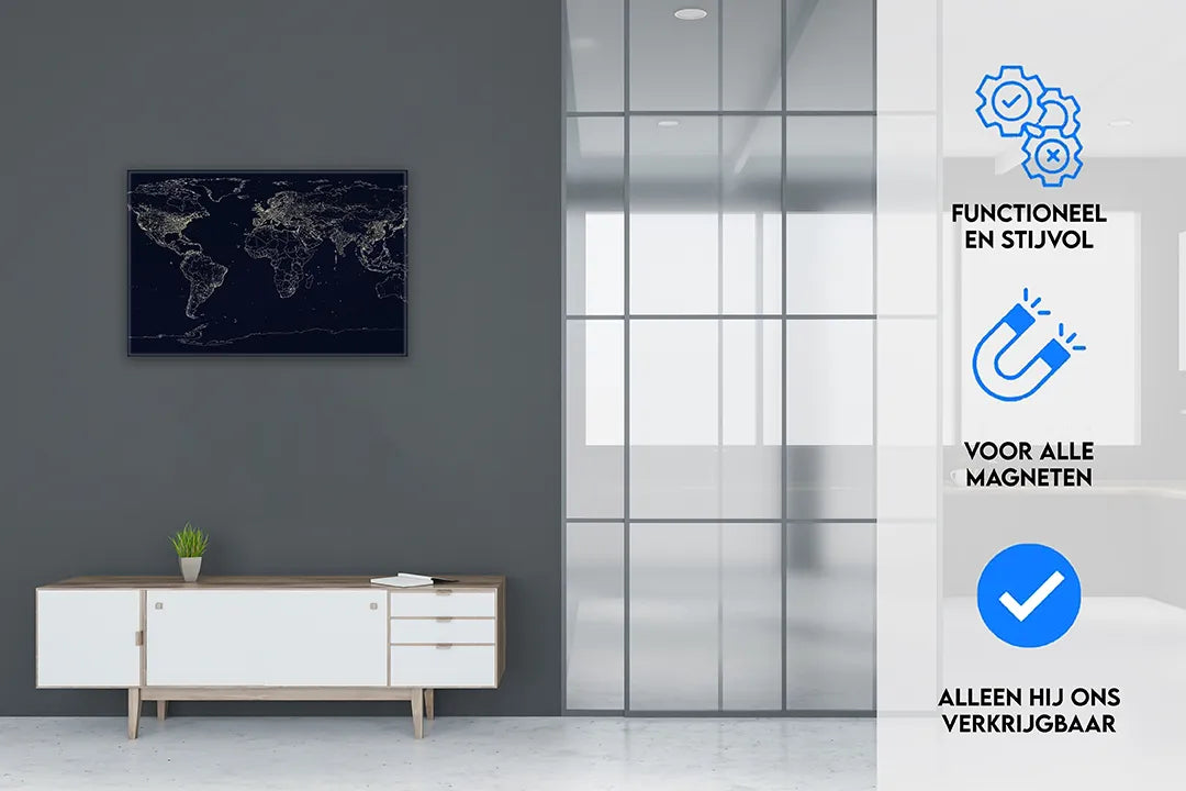 Metalen magneetbord wereldkaart in sterrenlicht – droog uitwisbaar & magnetisch