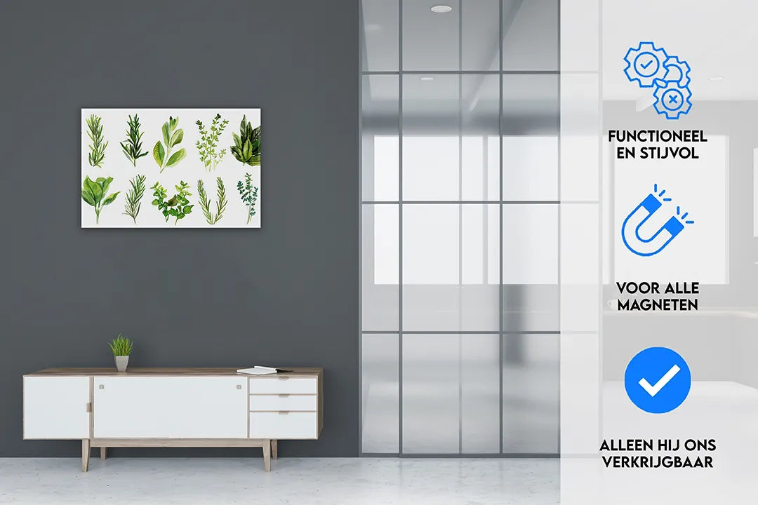 Stijlvol metaal magneetbord met groene kruidenillustraties – droog uitwisbaar & magnetisch
