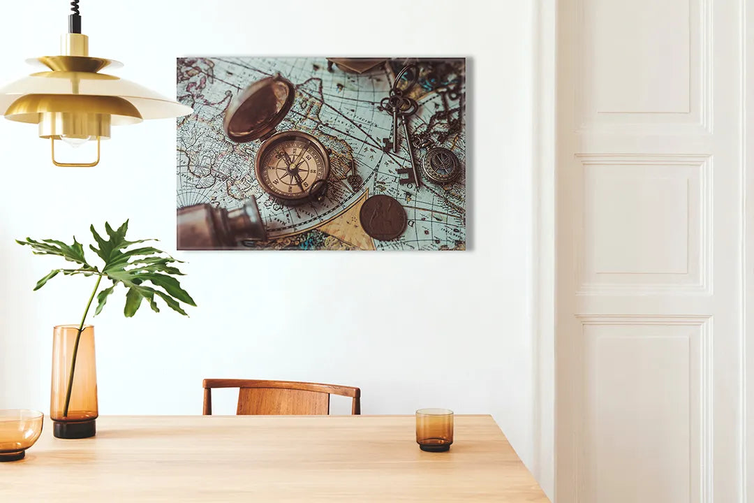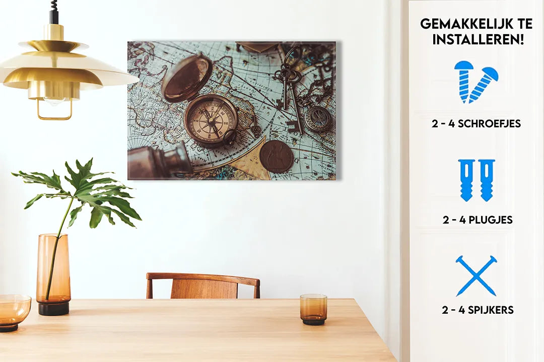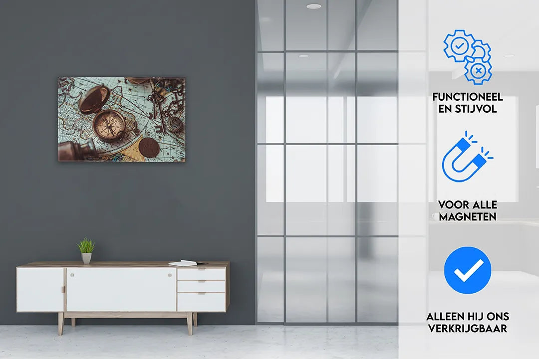 Metalen magneetbord met vintage wereldkaart en kompas – droog uitwisbaar & magnetisch