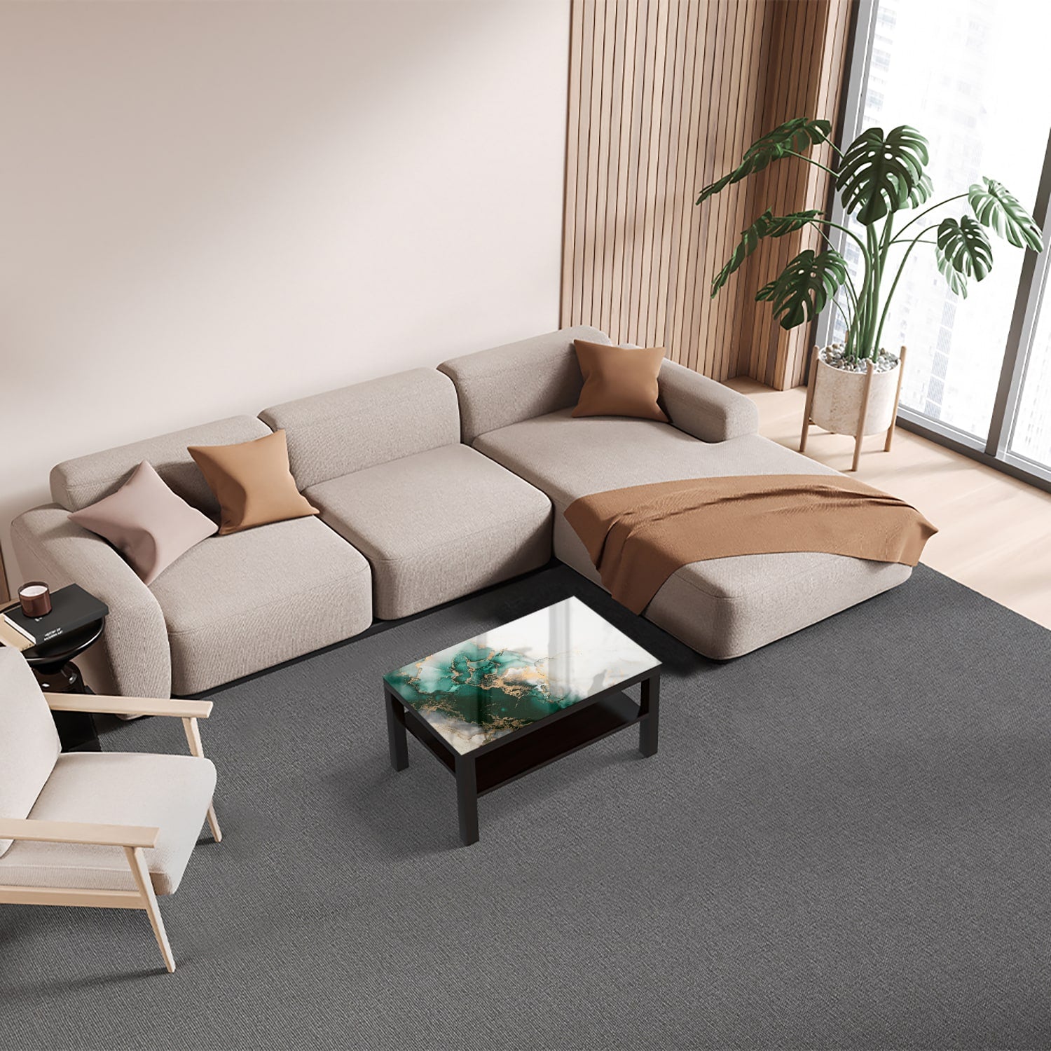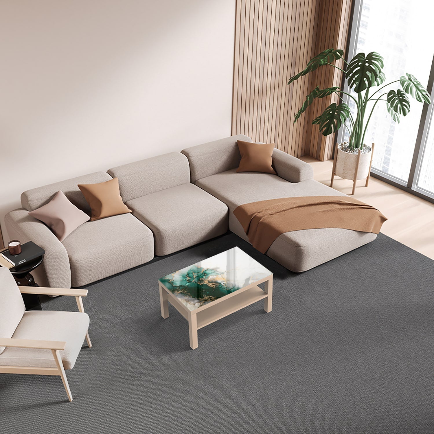 Een modern en duurzaam alternatief voor een sfeervolle kamer: de iconische Ikea Lack tafel met glazen tafelblad.